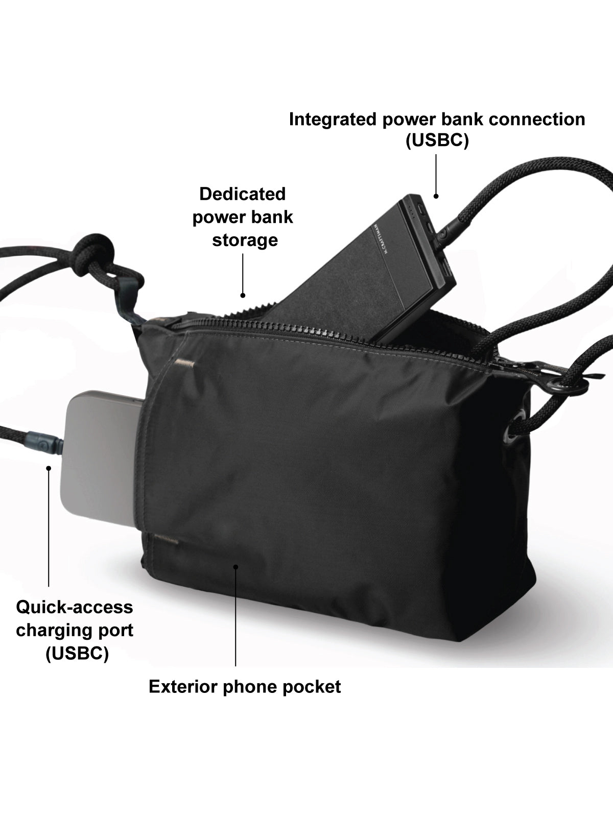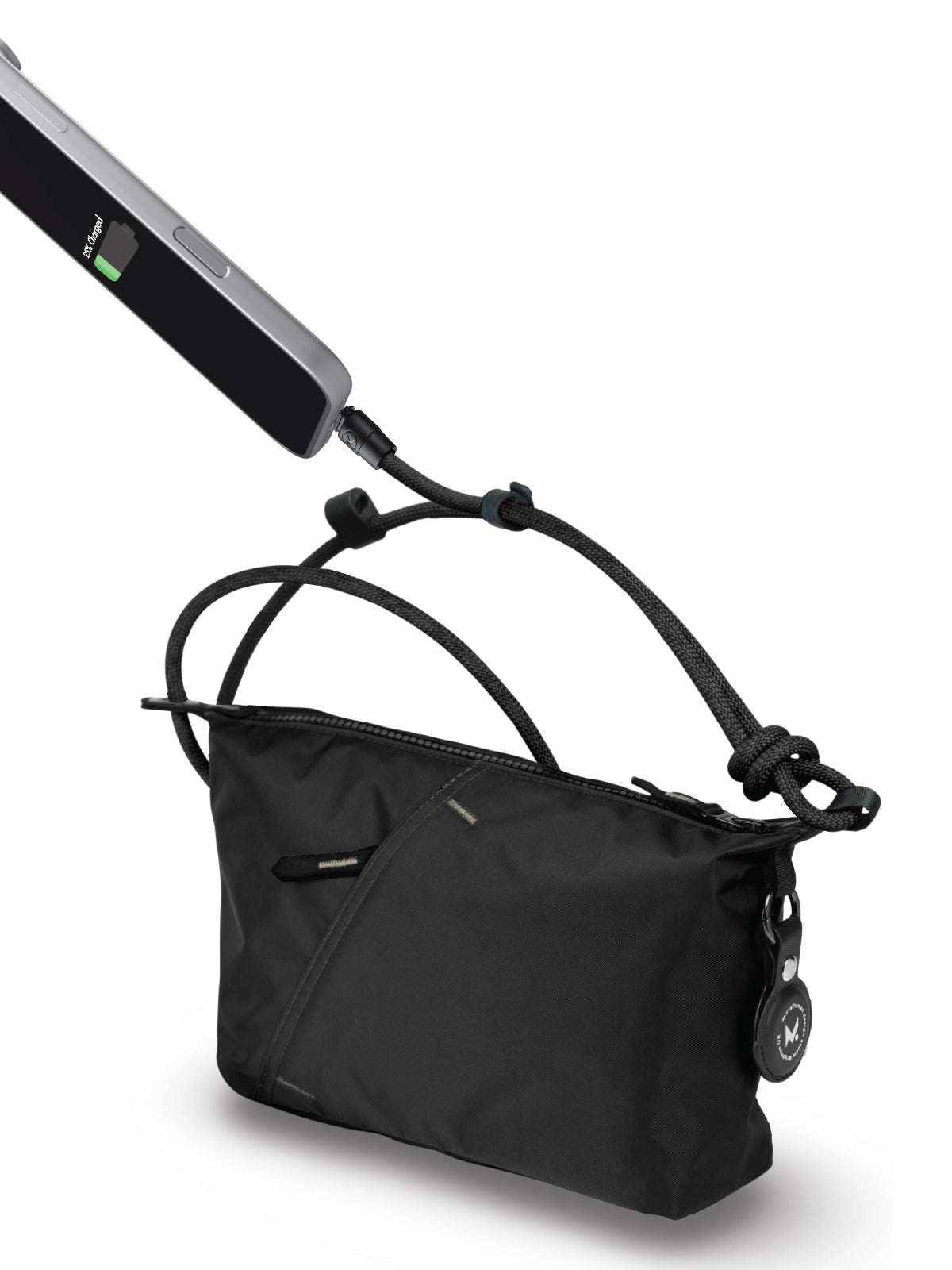 · Equipped with a 8 mm USB-C to USB-C connection, it functions effortlessly as both a refined shoulder strap and a high-performance charging cable.